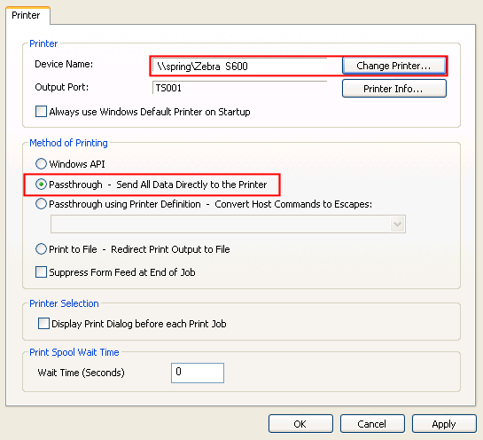 | The label printer must be set up as a local or network printer. In the Bluezone DMS emulation menu (Drive or WebSuite), under File | Print Setup, set it up like this: |