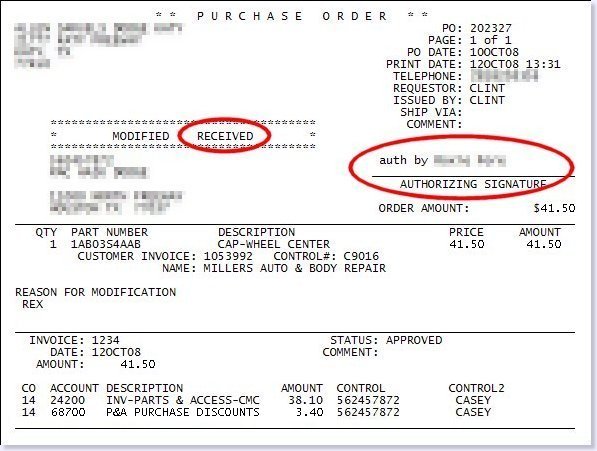 The printed PO is similar to ADP's, but indicates the emergency receipt, and an "auth by" printed signature if the non-inventory accounting is within the setup requirements. |