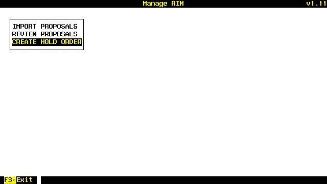 It finds the same parts and quantities that RIM would find tonight and creates order lines for them. Then, using RVST, you can review the order, releasing (cancelling) whatever you want RIM to go ahead and order. This allows you to place an order, for example, to an ACDelco vendor before RIM orders those parts. This can also be used to build quantities for program orders by leaving the hold orders until you are ready to place the program order. |